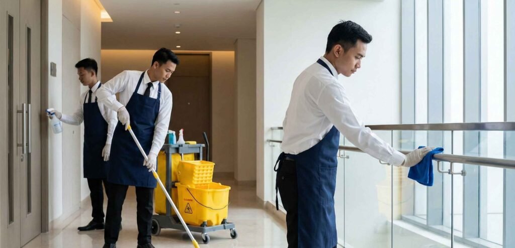 Membersihkan bangunan gedung, hotel, atau fasilitas umum seperti menghilangkan noda/kotoran, menjaga kebersihan lingkungan dan sebagainya.