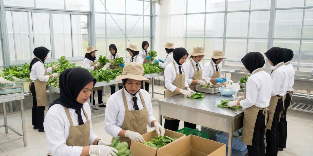 Budidaya tanaman, sayuran, buah-buahan, padi, dll meliputi proses penanaman, pemeliharaan, panen dan penyortiran hingga pengemasan.
