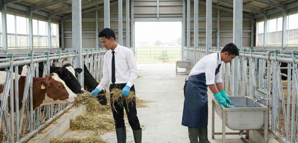 Perawatan harian hewan ternak meliputi pemberian pakan, pembersihan kandang, pemantauan keberihan dan kesehatan hewan ternak, hingga pengelolaan hasil ternak.